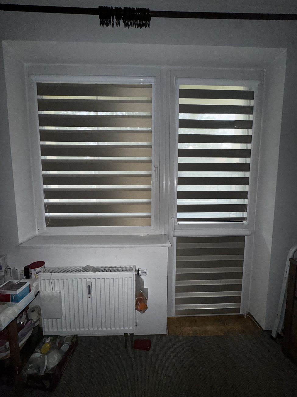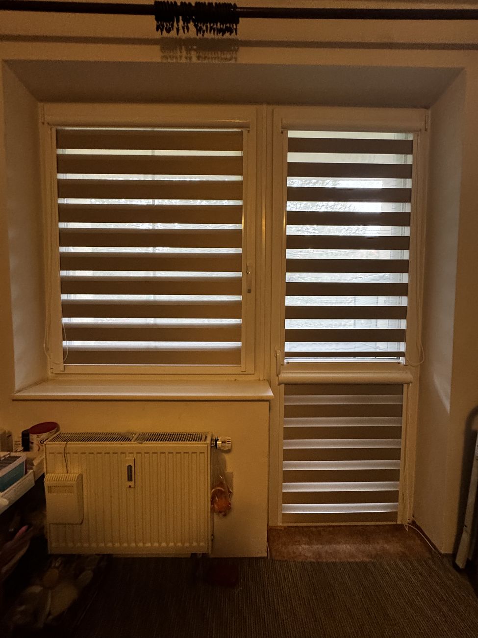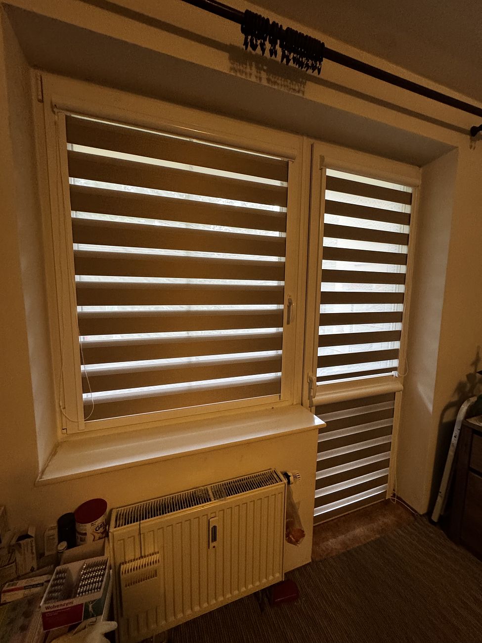 V červnu jsem realizoval zakázku v bytě v Nymburce, kde si zákazník přál nahradit původní, více než 20 let staré žaluzie modernějším a praktičtějším řešením. Volba padla na pět rolet den a noc, které díky střídajícím se pruhům průsvitné a plné látky umožňují perfektní regulaci světla. Zvolená pogumovaná látka duo rolet zároveň blokuje ostré západní slunce a poskytuje interiéru příjemné klima i během letních odpolední.